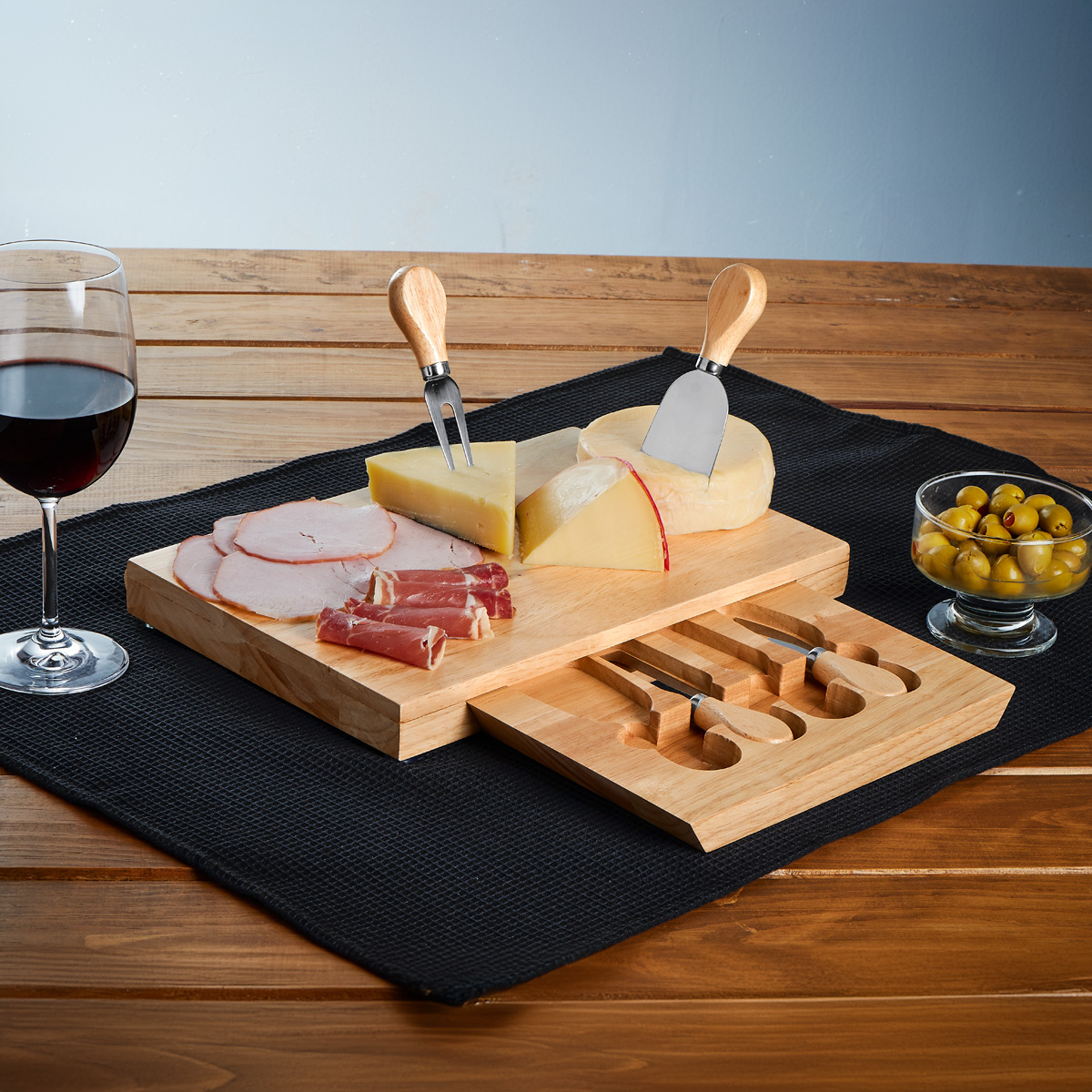 Set con 1 tabla y base deslizable con 3 cuchillos y 1 tenedor para quesos. La madera es un producto natural el cual puede presentar variaciones en tonalidades y vetas.