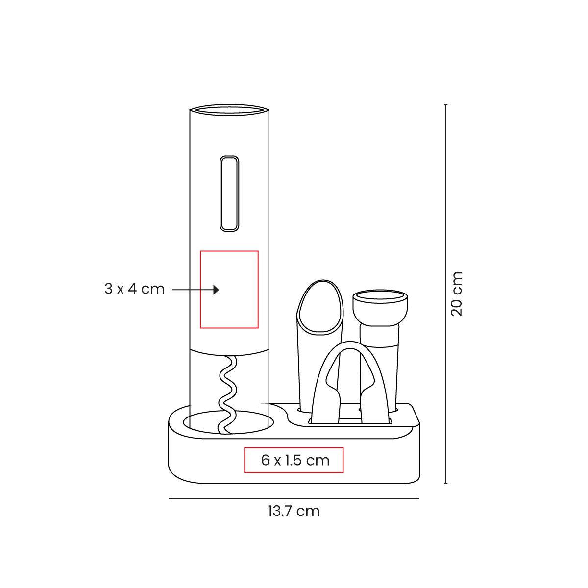 Set de sacacorchos eléctrico. Contiene 1 sacacorchos con batería recargable y puerto tipo C, 1 cortador de papel aluminio, 1 vertedor para evitar salpicaduras, 1 tapón protector de vacío y 1 base para organizar los diferentes accesorios. Incluye cable auxiliar, manual de uso y caja individual.