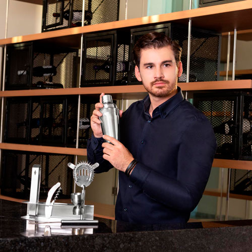 Set para preparación de bebidas con base. Incluye shaker, pinzas, dosificador, colador, cuchillo, sacacorchos con navaja y destapador.