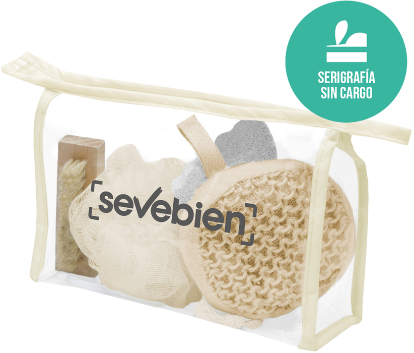 18,5 x 12 x 5 cm. Plástico. Set con 2 esponjas una es exfoliante, piedra/lima y cepillo de uñas.