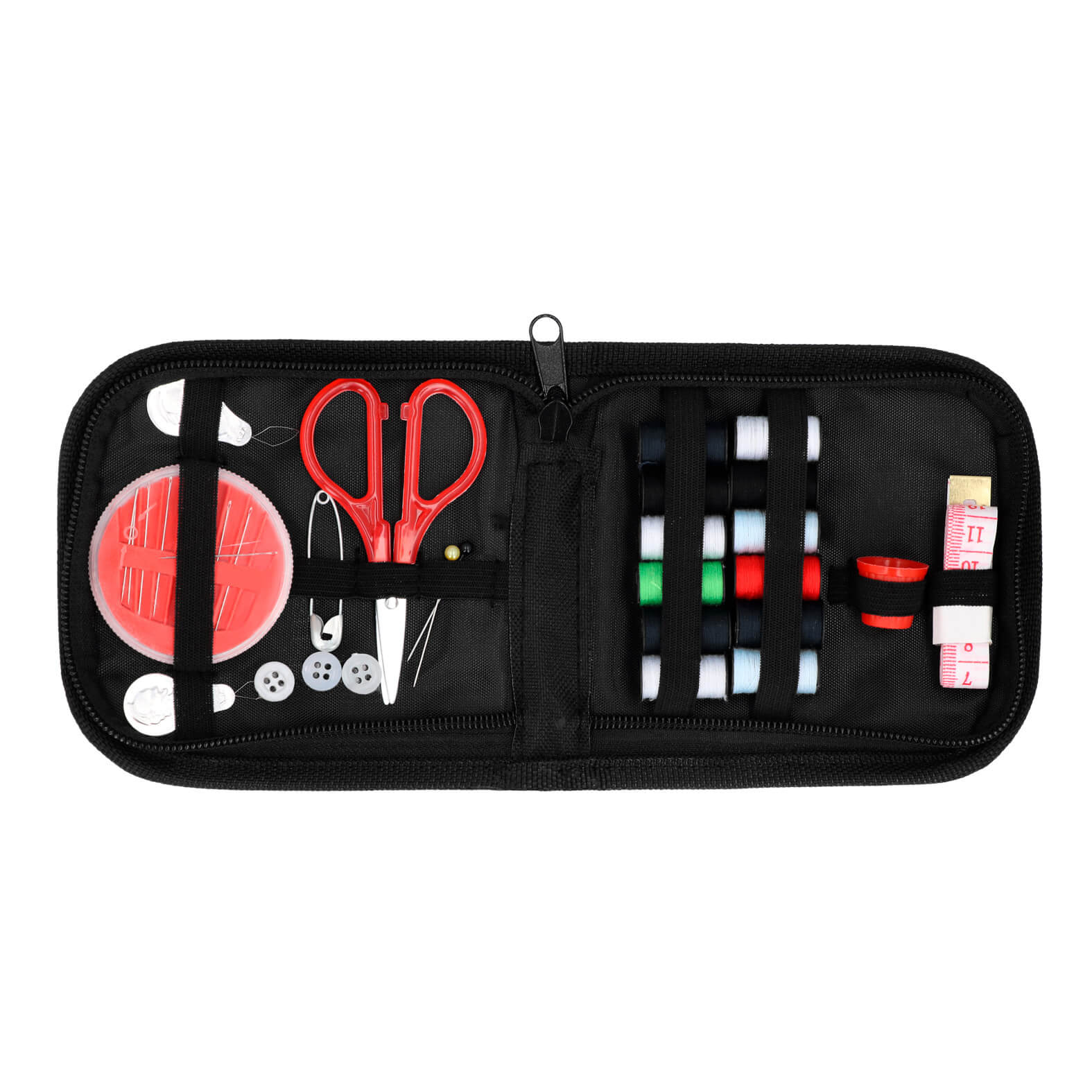 Set de costura de poliéster con cierre que incluye: 2 ensartadores de hilo, estuche con 10 agujas, 3 botones, 1 seguro, tijeras, 2 alfileres, 12 carretes de hilo de colores, dedal y cinta métrica.
