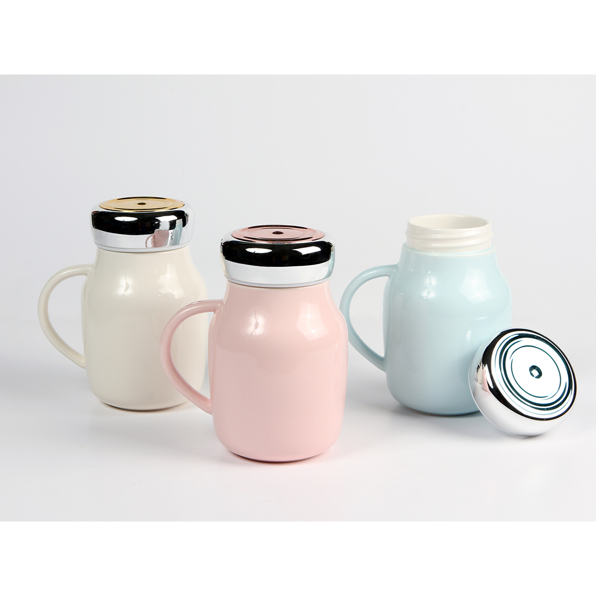 Taza de cerámica con tapa plástica en acabado cromado. Capacidad de 450 ml. Incluye caja de cartón individual.