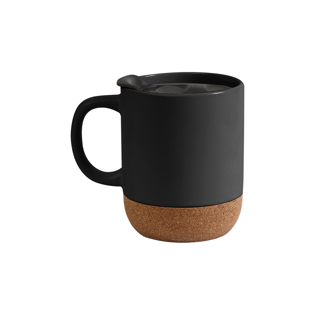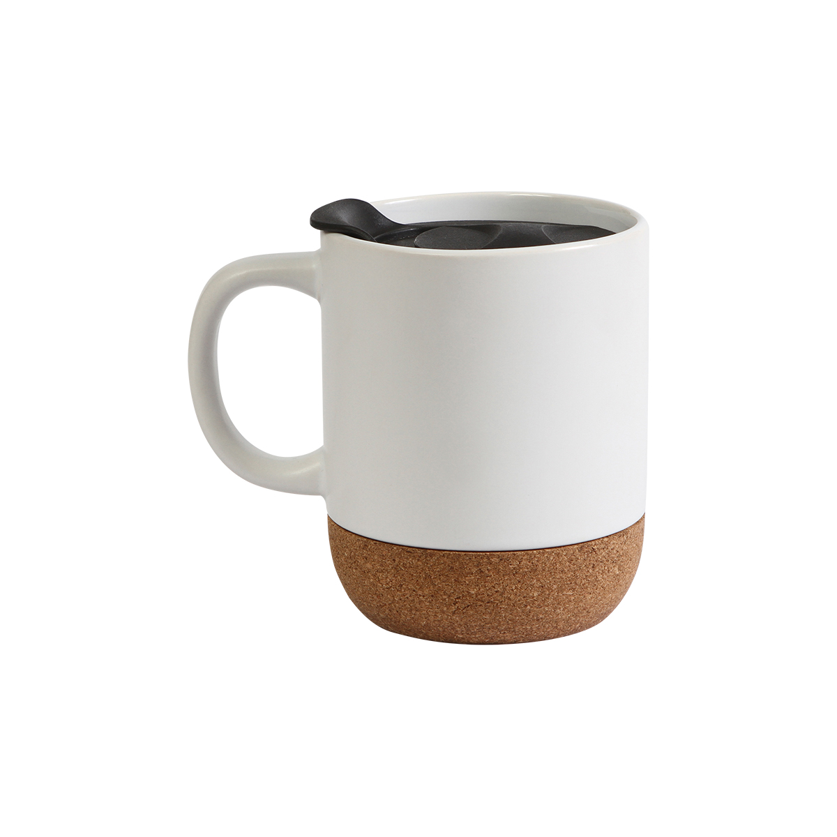Taza de cerámica con base de corcho aislado extraíble y tapa deslizable de PP (polipropileno). Ideal para té o café. Capacidad 400 ml. Incluye caja de cartón individual.