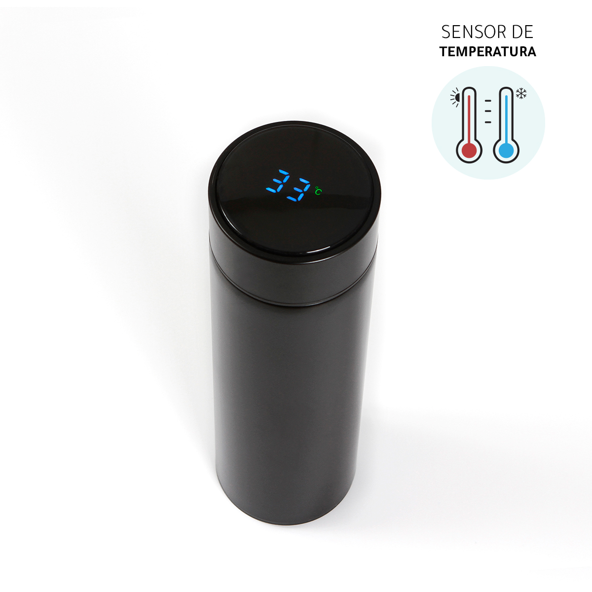 Termo inteligente de acero inoxidable doble pared; con pantalla LED indicadora de temperatura interior en la tapa. Fabricado en materiales de grado alimenticio, mantiene bebidas frías o calientes por un largo tiempo. La batería dura hasta 2 años. No usar en microondas. Capacidad de 500 ml. Incluye caja de cartón individual.