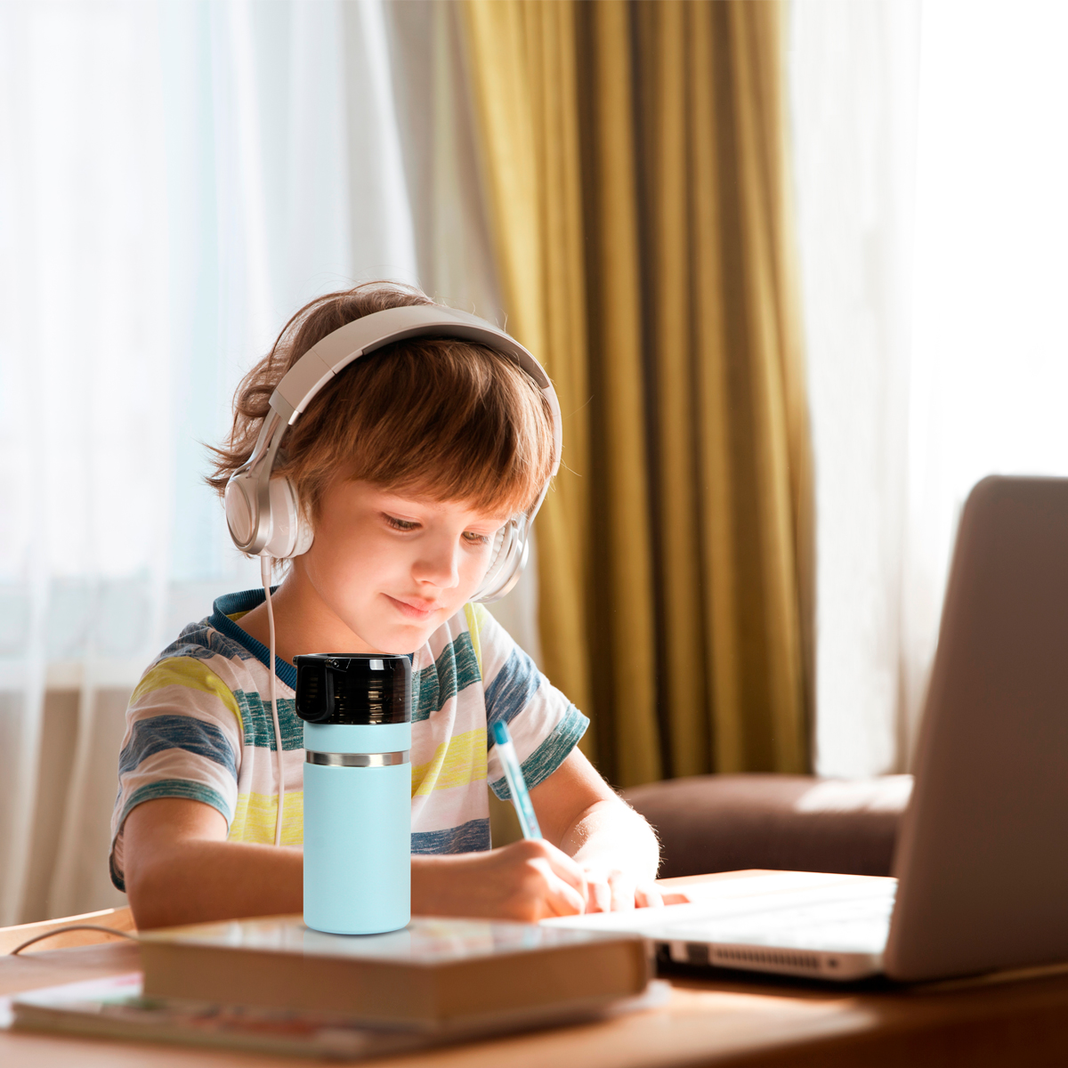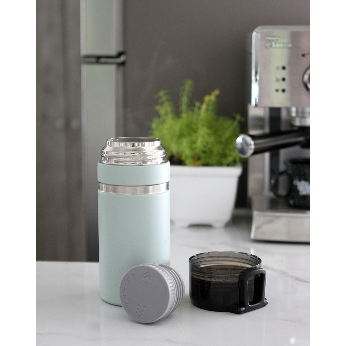 Termo de acero inoxidable doble pared con tapa y asa de plástico. Fabricado en materiales de grado alimenticio, mantiene bebidas frías o calientes por un largo tiempo. No usar en microondas. Capacidad de 500 ml. Incluye caja de cartón individual.