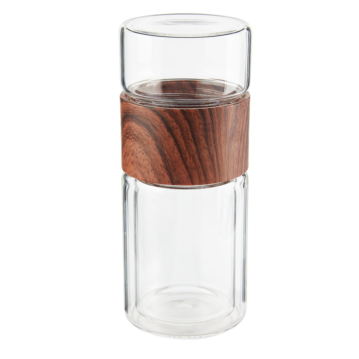 Termo de vidrio de doble pared para bebidas calientes y frías. Tapa de rosca que evita derrames. Contiene una separación de infusor removible para té de acero inoxidable. Su colador y doble vaso permiten preparar infusiones. Incluye caja individual.
