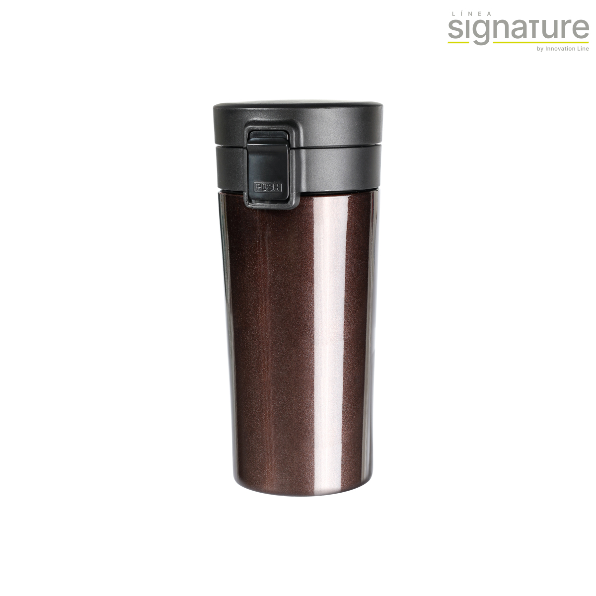Termo de acero inoxidable doble pared con tapa de seguridad y sistema automático de apertura, fabricado en materiales de grado alimenticio, mantiene bebidas frías o calientes por un largo tiempo, no usar en microondas. Capacidad de 350 ml (12 oz).