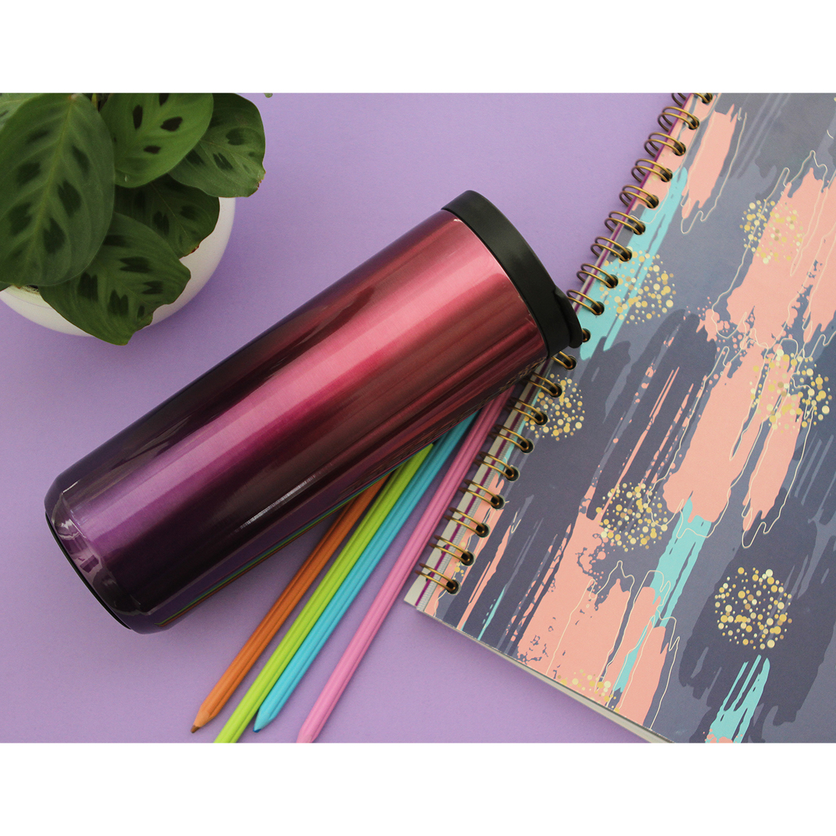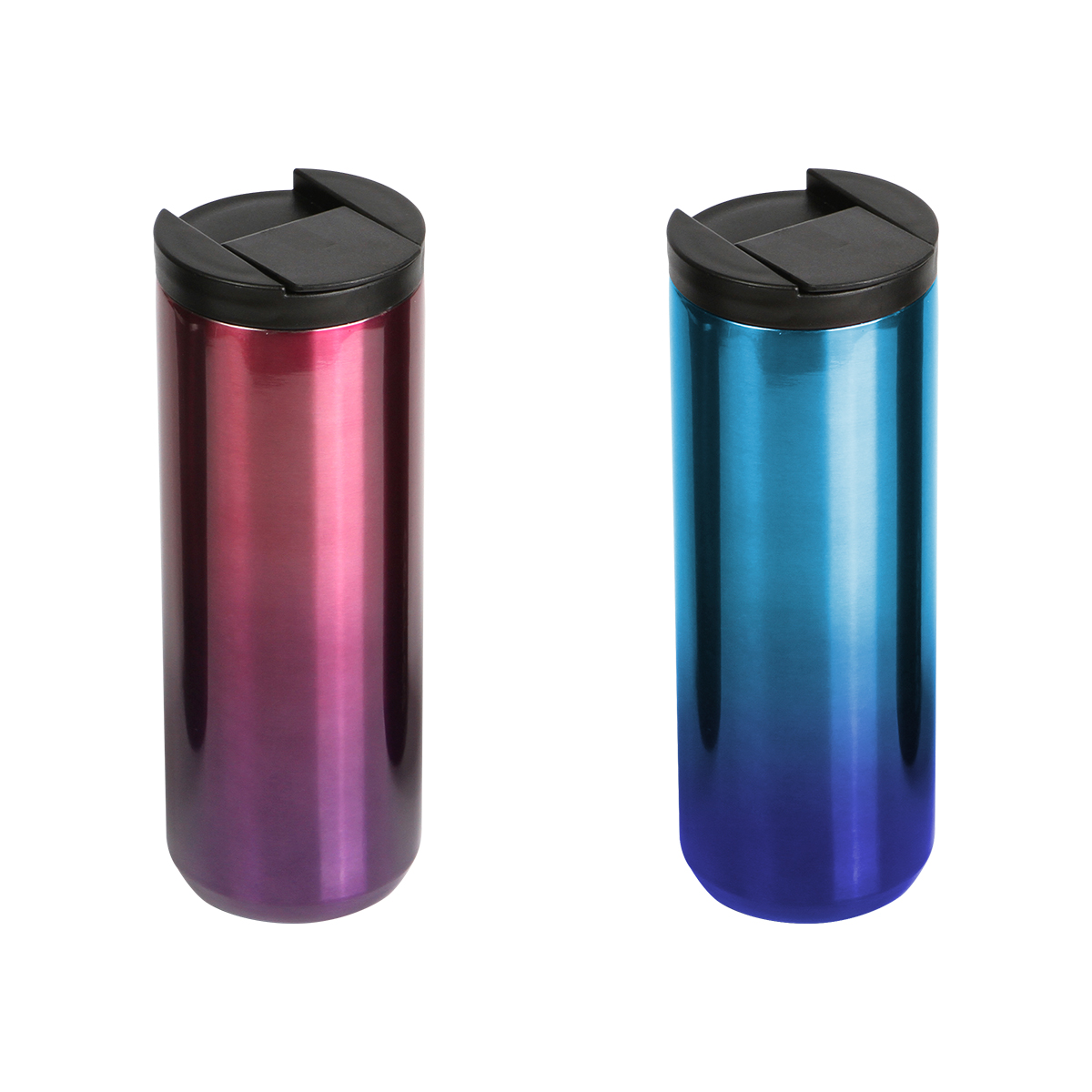 Termo doble pared de acero inoxidable con tapa plástica, cuerpo en colores degradados, mantiene bebidas frías o calientes por un largo tiempo. No usar en microondas. Capacidad de 500 ml. Incluye caja de cartón individual.