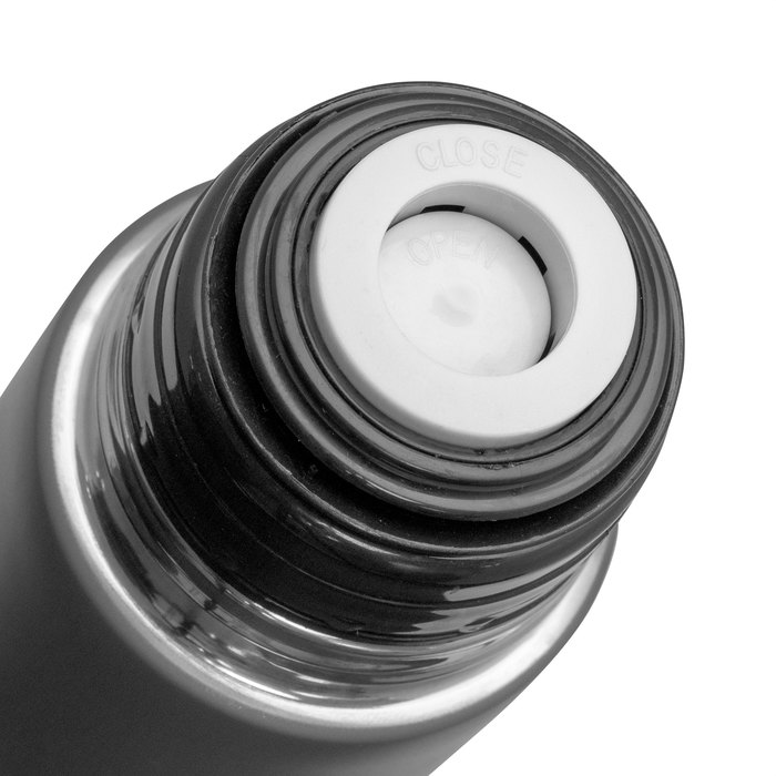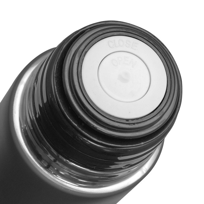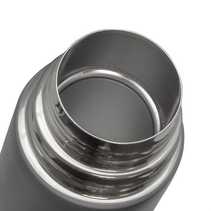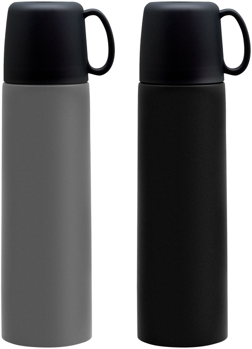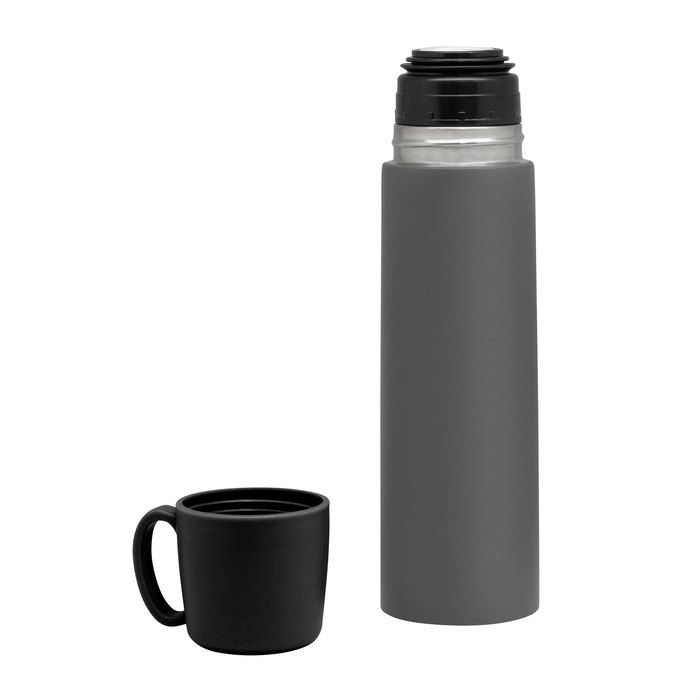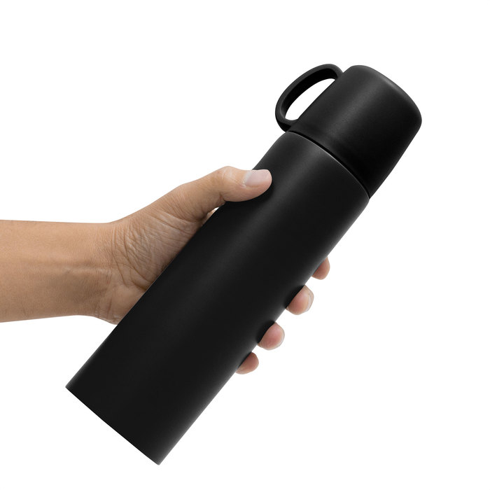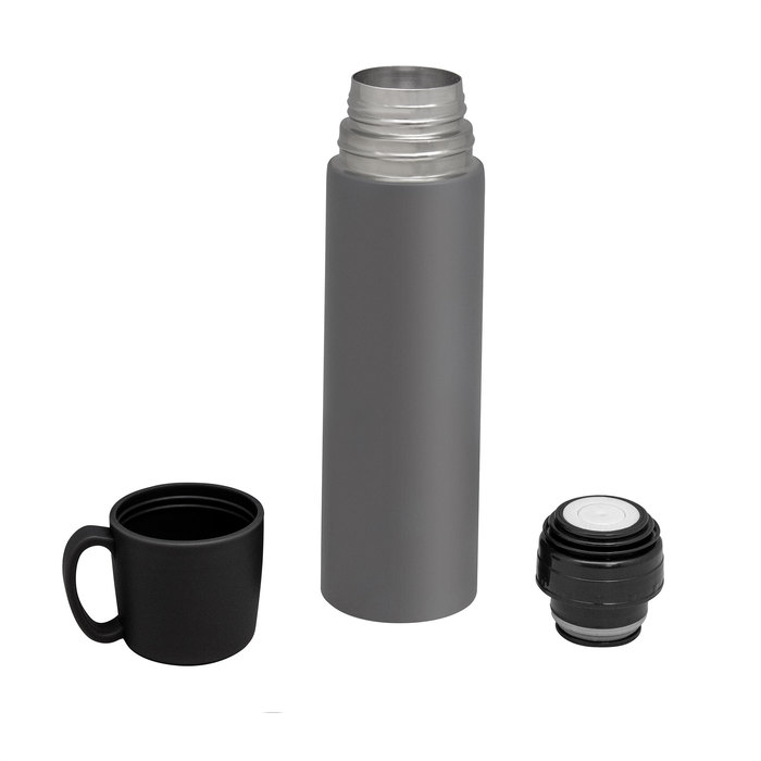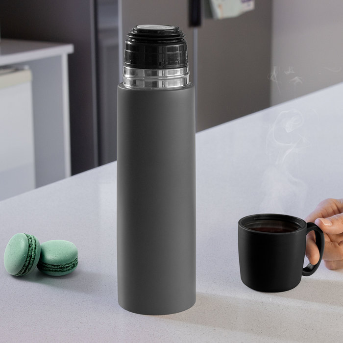 8,1 x 6,8 x 25 cm. Capacidad 500 ml. Acero inoxidable y Polipropileno. Termo con doble pared sellado al vacío. Acero inoxidable 304 interior / 201 exterior. Tapa y taza plásticas en color negro. Pintura acabado mate. Mantiene hasta 12 hs la temperatura de las bebidas calientes y 24 hs de las bebidas frías. Presentación en caja de regalo Kraft.