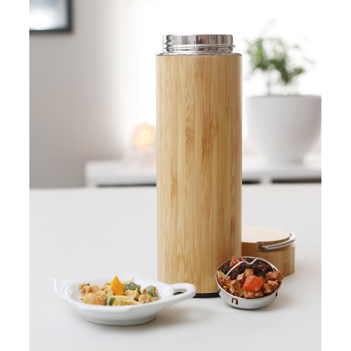 Termo doble pared fabricado en acero inoxidable con recubrimiento exterior de bambú; rejilla metálica y asa en la tapa. Fabricado con materiales de grado alimenticio, mantiene bebidas frías o calientes por un largo tiempo, no usar en microondas, capacidad 450 ml. Incluye caja de cartón individual.