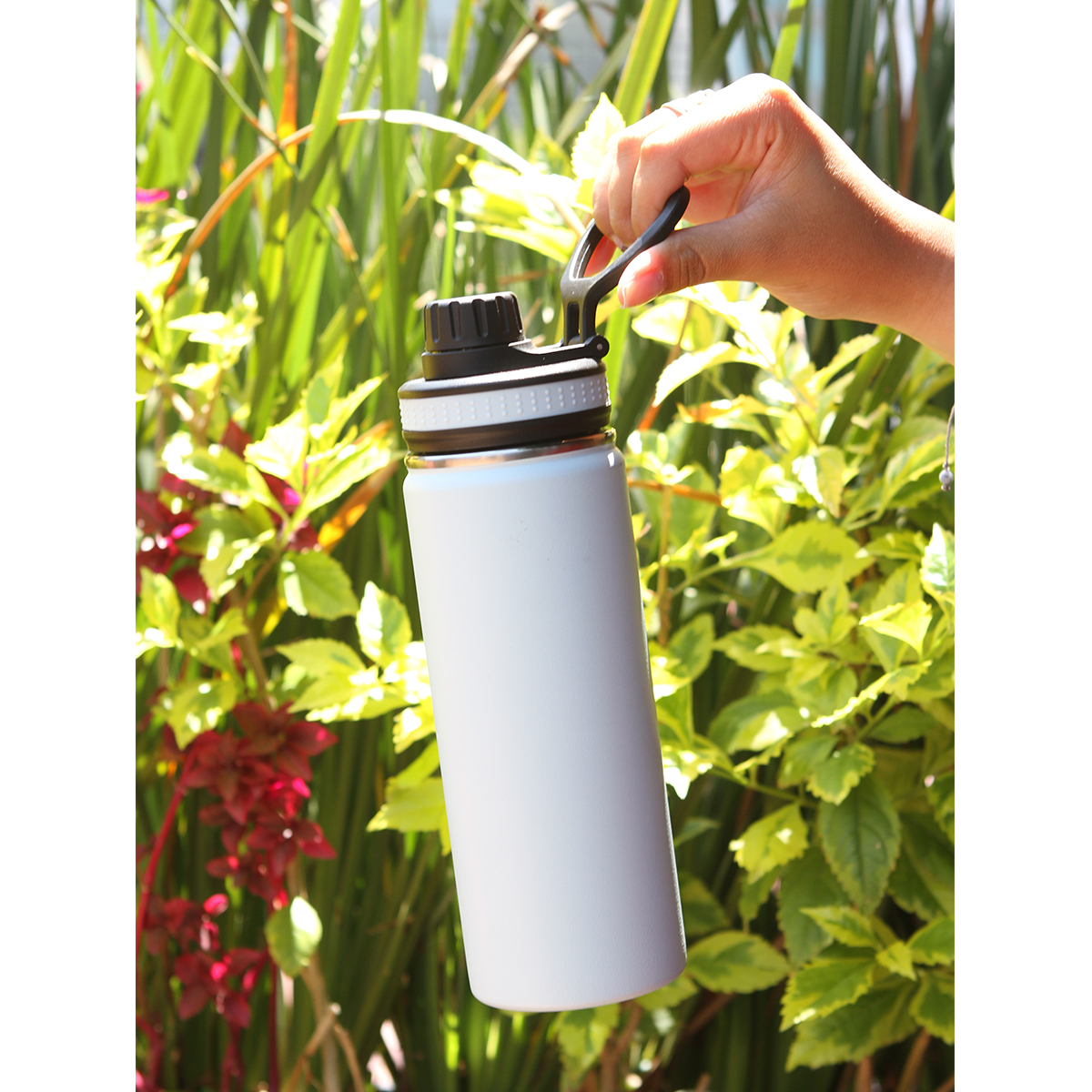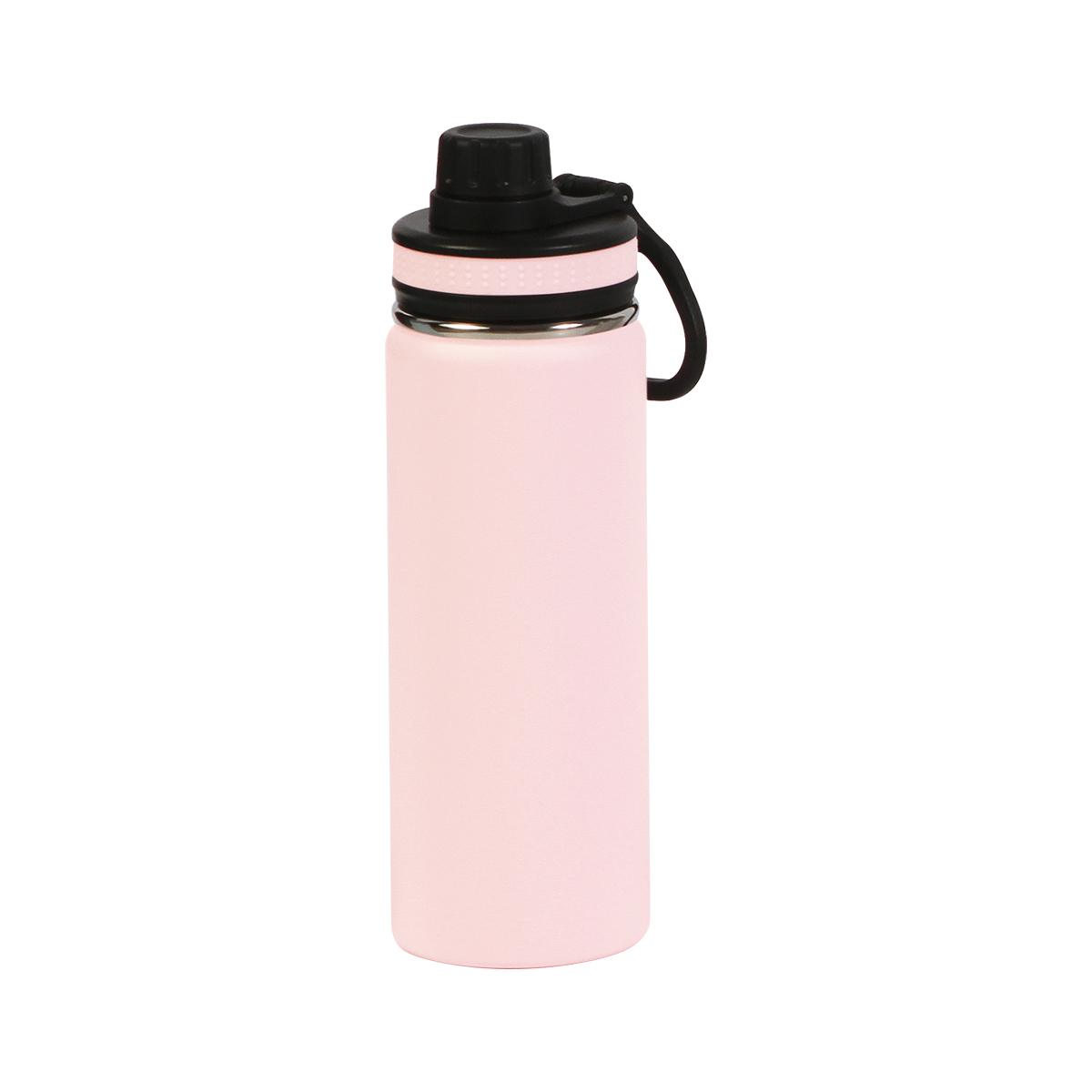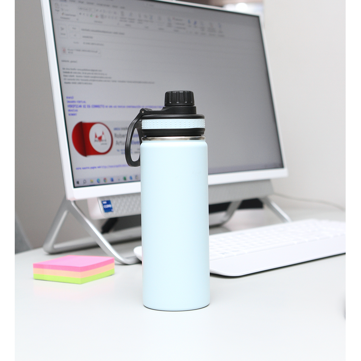 Termo de acero inoxidable doble pared acabado mate, tapa de rosca con boquilla y asa de plástico. Fabricado en materiales de grado alimenticio, mantiene bebidas frías o calientes por un largo tiempo. No usar en microondas. Capacidad de 500 ml. Incluye caja de cartón individual.