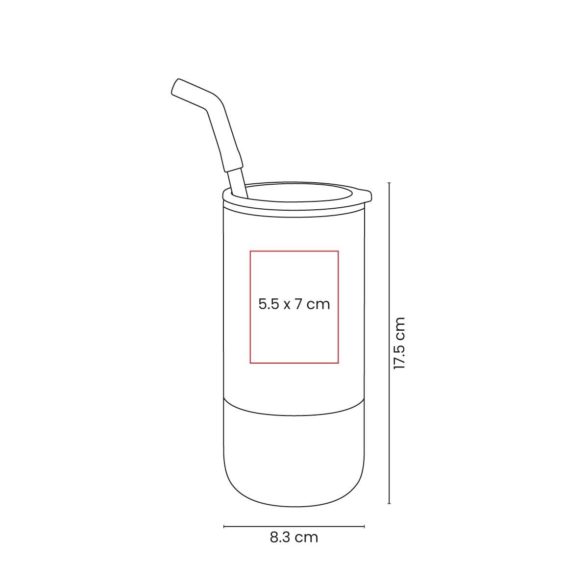 Doble pared. Pared interna plástico, pared externa acero inoxidable. Tapa de plástico con válvula de seguridad y popote metálico con boquilla removible de rubber. Incluye caja individual.