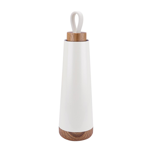 Doble pared. Cerrado al vacío. Pared interna y externa acero inoxidable. Tapa de madera con sistema de rosca y agarradera de silicón. Mantiene temperatura caliente 6 hrs y temperatura fría 12 hrs aproximadamente. Incluye caja individual.