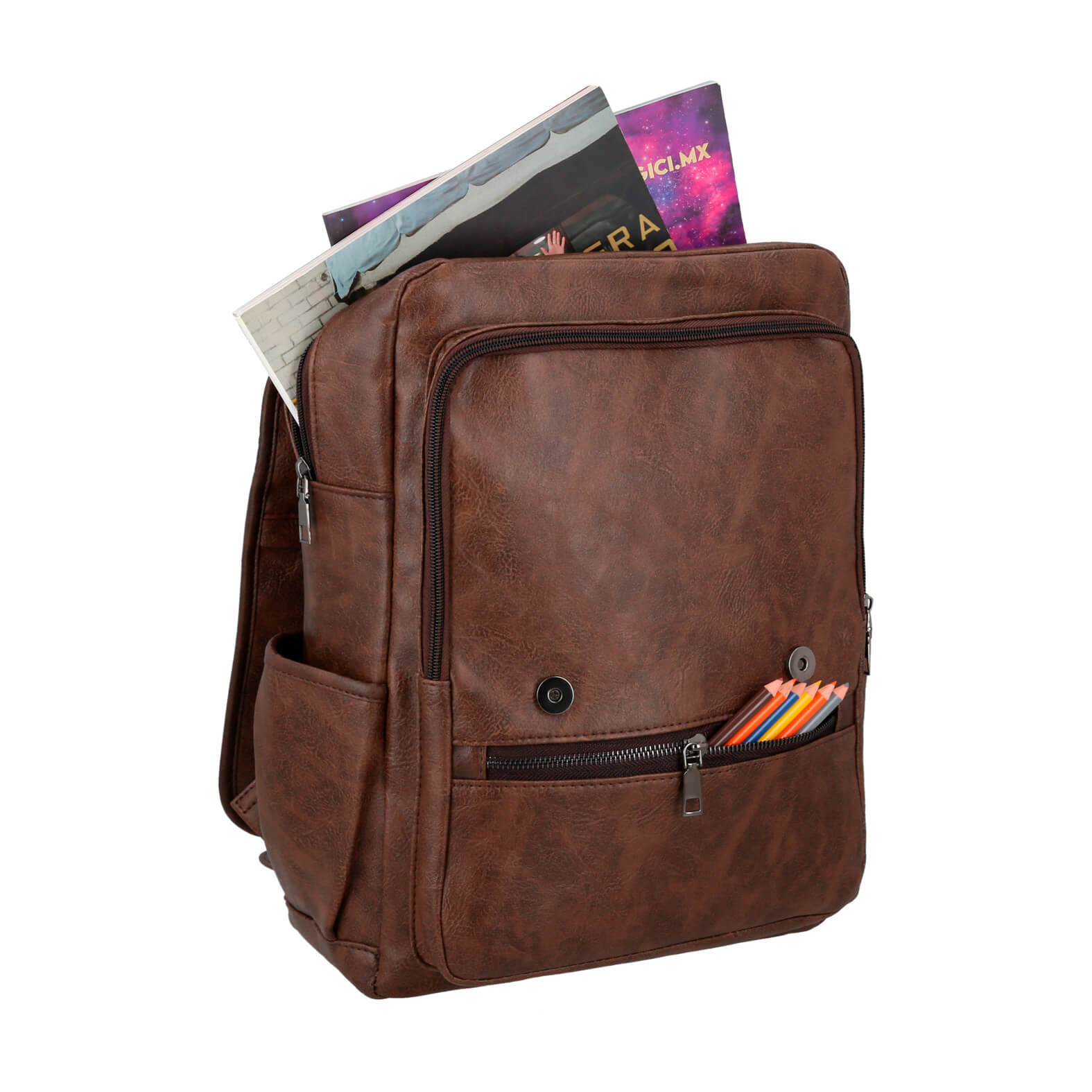Mochila de curpiel de 1 compartimento principal con porta laptop y organizador interno, 1 compartimento secundario, 2 bolsas frontales con cierre, 2 bolsas laterales, tirantes y asa superior.