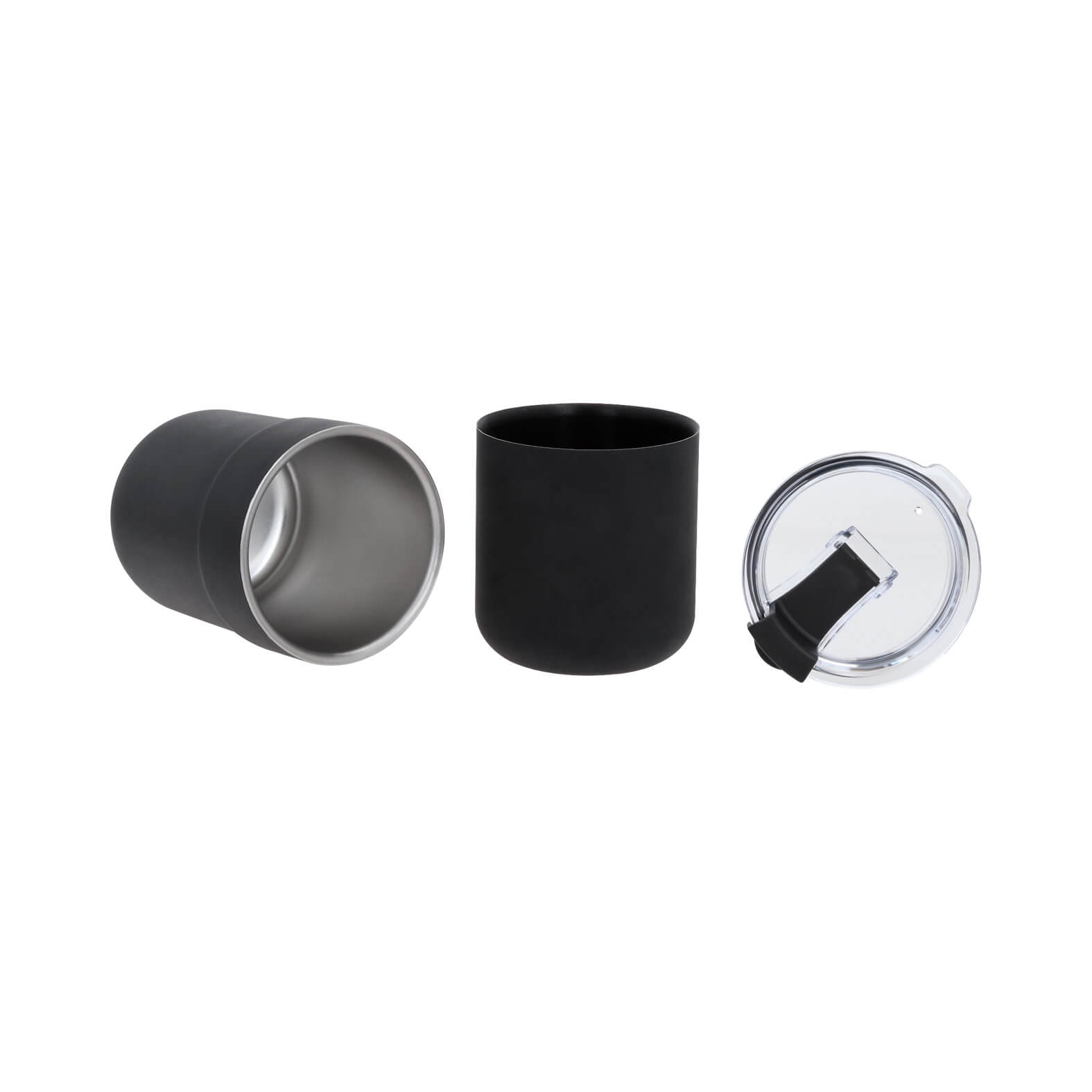 Termo con doble pared de acero inoxidable, insulado al vacío, acabado rugoso, con manga de silicón y tapa de cierre a presión.