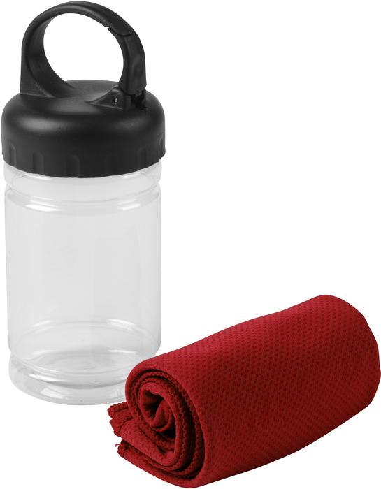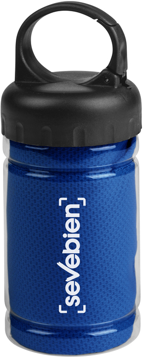 Medidas toalla 79 x 29 cm / Medidas frasco: Ø6,5 x 17 cm. Políester. Toalla de enfriamiento en un estuche de plástico transparente. Para un efecto refrescante humedezca la toalla con agua o agregue agua en el cilindro e incorpore la toalla. Tapa a rosca con mosquetón.