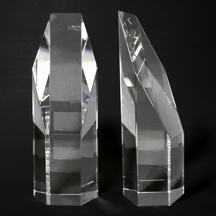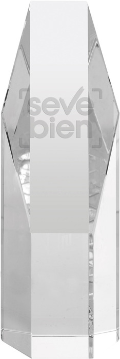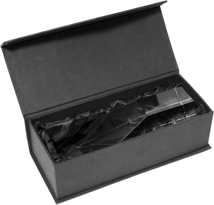 19 x 5,6 x 3 cm. Cristal. Bloque de cristal en forma de prisma 3D. Corte diagonal en la parte superior. Permite grabado de logo o texto. Presentación en estuche con cierre magnético.