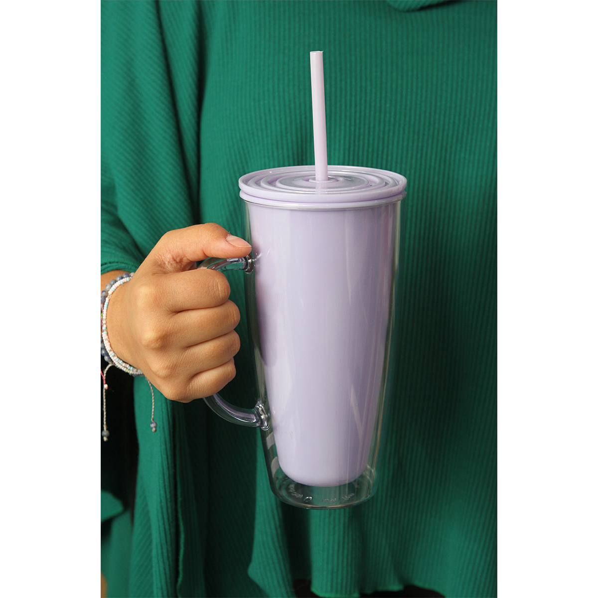 Vaso doble pared (color y transparente) fabricado en acrilonitrilo estireno (AS) y tapa fabricada en polipropileno (PP). Capacidad de 24 onzas (720 ml). Cuenta con agarradera y popote.