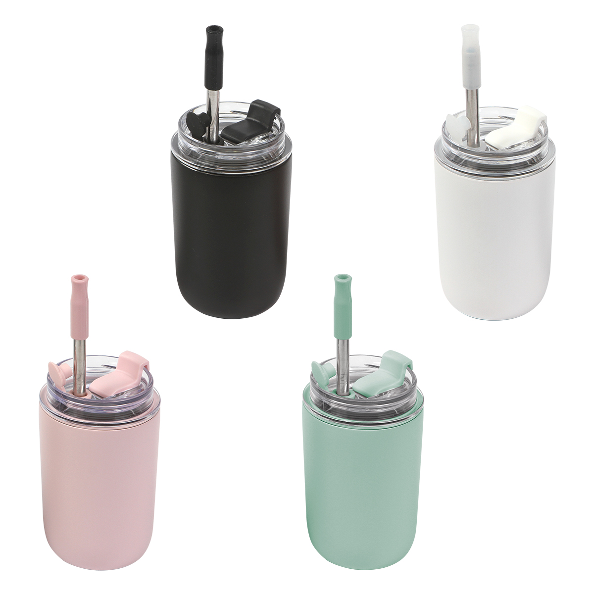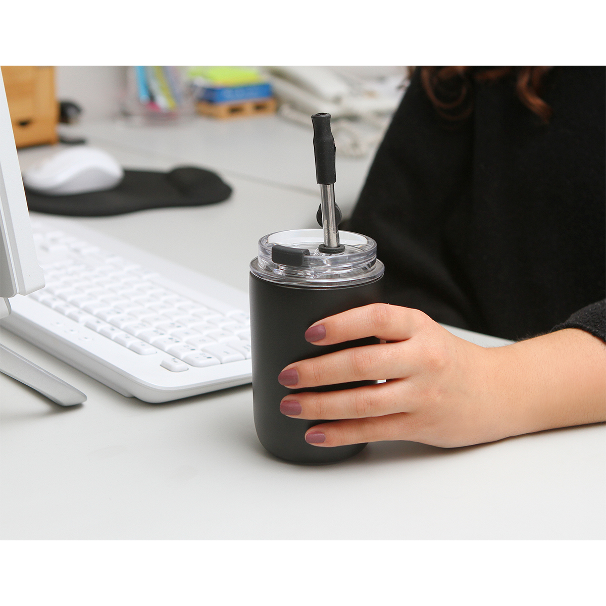 Vaso de acero inoxidable doble pared con tapa de plástico deslizable y popote de metal con detalle de silicón en la parte superior. Fabricado en materiales de grado alimenticio, mantiene bebidas frías o calientes por un largo tiempo. No usar en microondas. Capacidad 300 ml. Incluye caja de cartón individual.