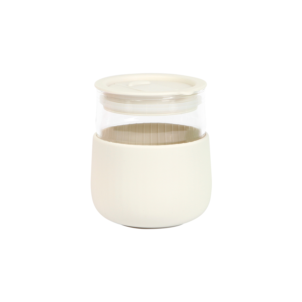 Vaso de vidrio de borosilicato con manga de silicón y tapa de plástico, fabricado en materiales de grado alimenticio. No usar en microondas. Capacidad de 380 ml. Incluye caja de cartón individual.