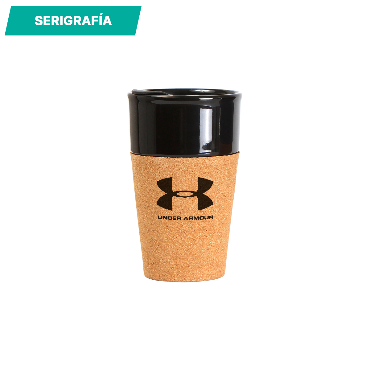 Vaso de color fabricado en cerámica con base de corcho y tapa de polipropileno (PP), tapa con boquilla abre fácil . Capacidad de 400 ml.